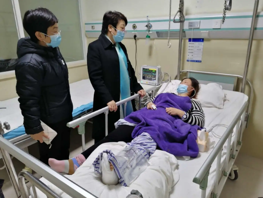 跌倒后,酒店管理人員將韓麗麗送往醫(yī)院,診斷為腳踝骨折,躺在病床上的韓麗麗告訴我們,她的工作地點(diǎn)在黃區(qū),負(fù)責(zé)背著消毒桶噴灑消毒液為往返隔離紅區(qū)的防疫志愿者做“首消”,她每天穿著嚴(yán)嚴(yán)實(shí)實(shí)的防護(hù)服,帶著口罩、護(hù)目鏡,向紅區(qū)志愿者的防護(hù)服和手套靴子上噴灑消毒液,還需要將志愿者從隔離區(qū)出來穿的靴子、手套浸泡在高濃度的84消毒液中,浸泡一小時(shí)后沖洗干凈。進(jìn)入黃區(qū)第二天她眼睛就嚴(yán)重的紅腫,嗓子干啞。韓麗麗說:“當(dāng)時(shí)部門負(fù)責(zé)人就勸我撤出來,我想再堅(jiān)持一下,就告訴部門經(jīng)理,我出不去,給我買點(diǎn)眼藥水就行,我要是再不舒服我就出來”,就這樣她一直堅(jiān)持著,因?yàn)樗恢庇浿蠉徢耙惶煺煞驀谕兴脑挘耙欢ㄒ眯?、?xì)心”。跌下樓梯不能動(dòng)彈的時(shí)候,她最著急的就是 “完了,堅(jiān)持不了了”。她現(xiàn)在最大的心愿就是趕緊好起來,不給單位添麻煩。
