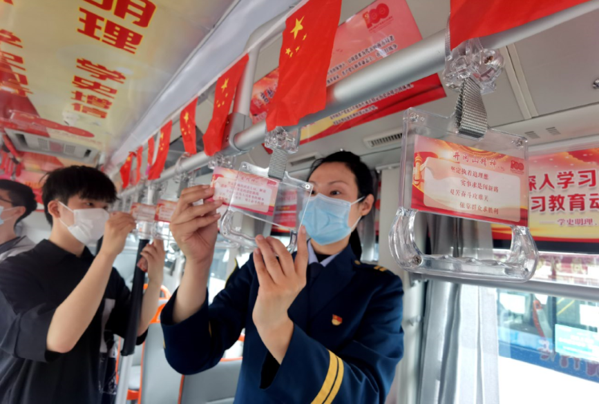 走進天津市公交集團第一客運公司5路駕駛員石霞的黨史主題車廂,隨處可見的紅色元素撲面而來。五星紅旗和黨旗在兩側(cè)飄揚,車頂“1921-2021學史明理、學史增信、學史崇德、學史力行”的主題字樣鮮艷奪目,兩側(cè)宣傳欄貼有“學黨史、悟思想、辦實事、開新局”標語,拉手環(huán)融入了紅船、井岡山和延安精神的紅色卡片,車載視頻中還播放著動人的黨史紅色故事,整個車廂生動展現(xiàn)出中國共產(chǎn)黨波瀾壯闊的百年奮斗歷程,乘客們被濃郁的紅色氛圍深深感染著。